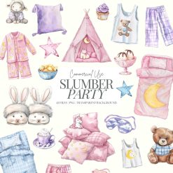 Pyjama Party Clipart | Sleepover PNG | Cozy Bedtime | Cute Slumber Party Bundle | Unicorn | Pink Slippers | Pillows | Watercolour | 45 PNG